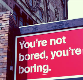 Boring is tiring. It is a decimator. Boring is adhering religiously – yes, religiously – to a certain set of circumspect rules that you allow to govern your life. You should stand up for yourself more. You should stand up to yourself more. We’re tyrants. Each one of us. That is perhaps no comforting thought, but it is fact. When you learn to meet and greet frequently your menace you will find yourself more able – and better-equipped – to face your demons. Demons are in fact not as terrifying as we make them out to be to ourselves. They all have their reasons, they all have a message to share. It is in watching their behaviour(s) that you will find resolution, if you choose to use their (very manageable) resources to your benefit. Again – that choice is up to you. Deny that you have demons and I will laugh.
